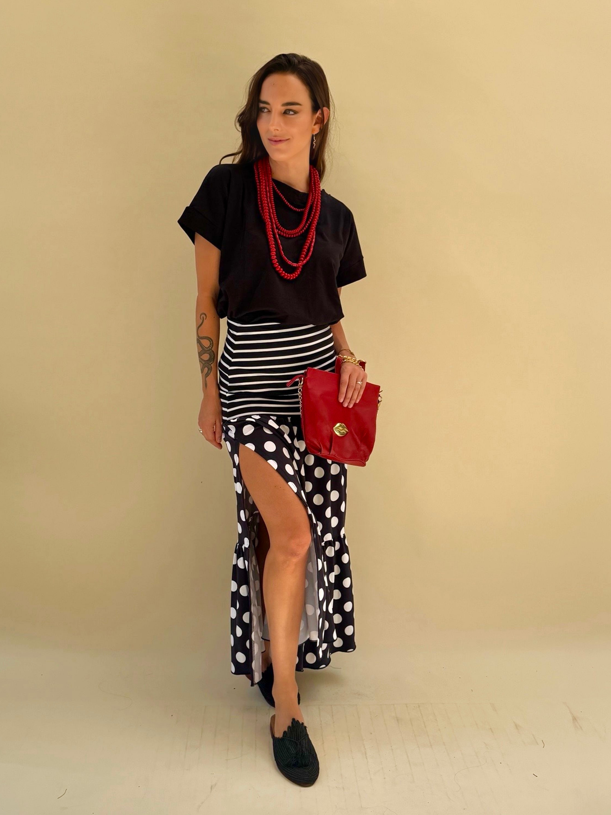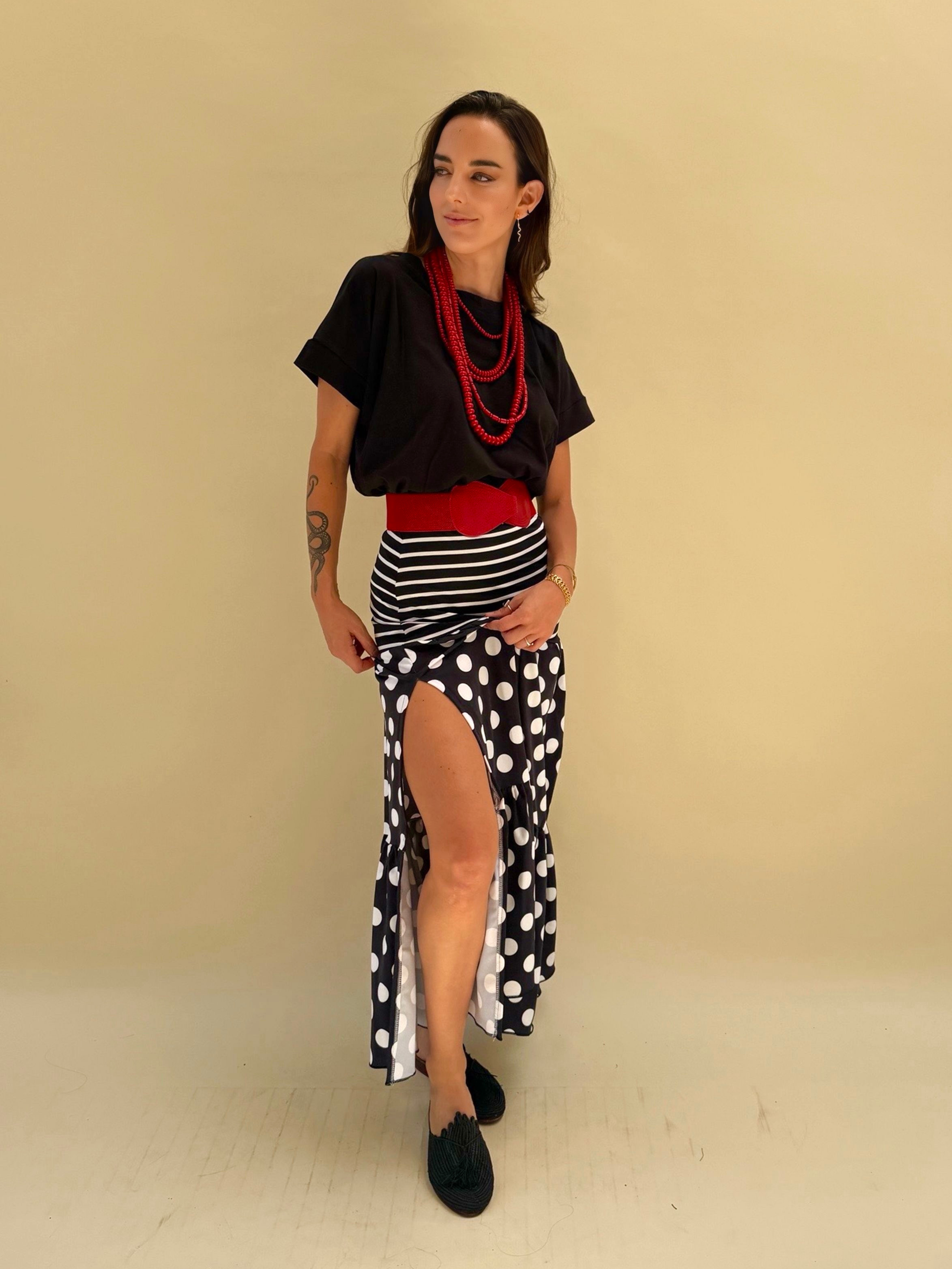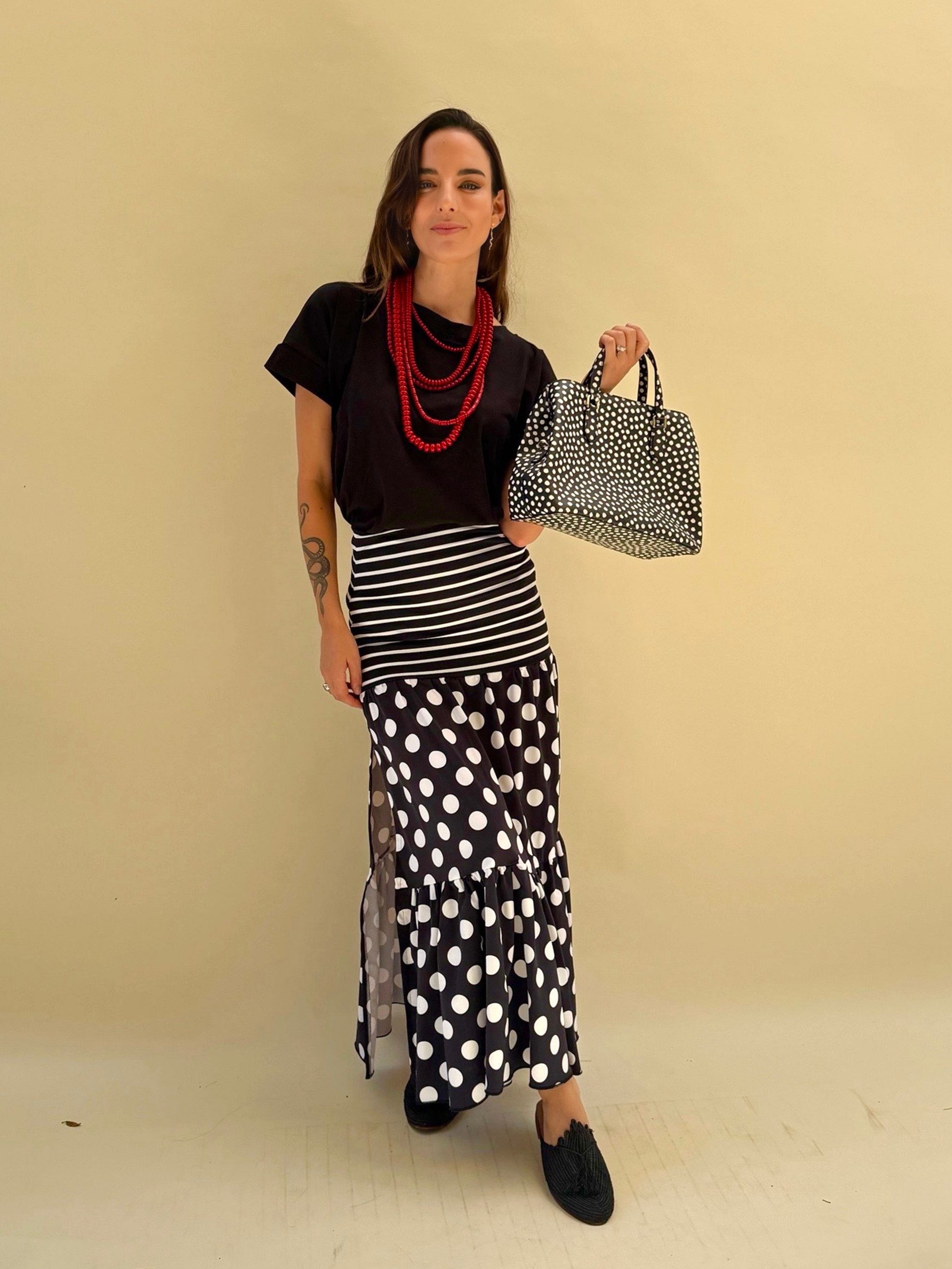 La tendencia de lunares llegó para quedarse. Esta preciosa falda con tajo lateral es perfecta para este verano. Usala para algo más formal o incluso para tu día a día. Es de Layra Dupont