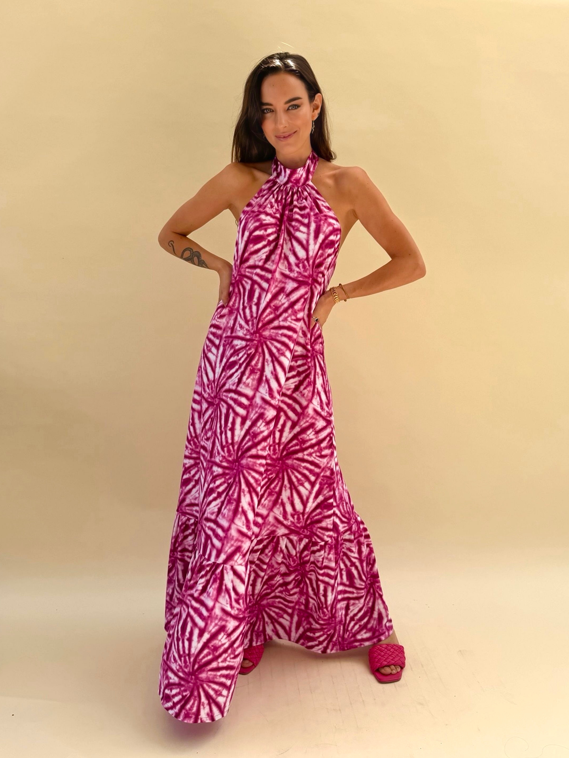 Este vestido largo con cuello halter destaca por su estampado, perfecto para lograr un look bomba.