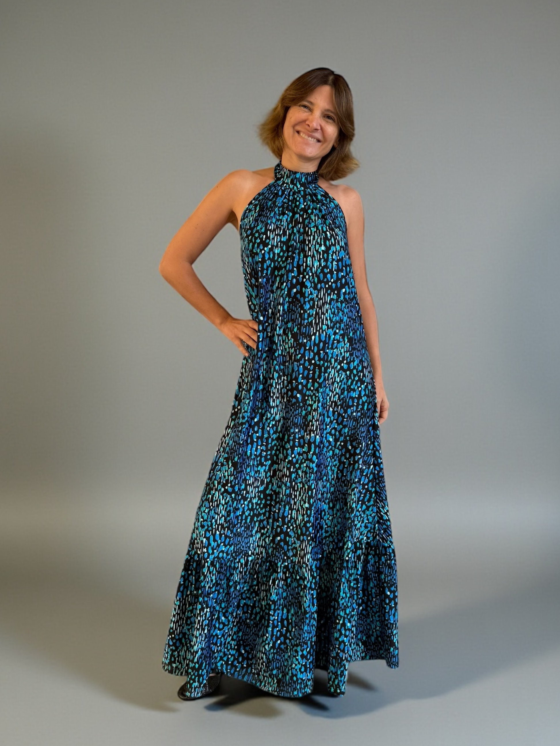 Este vestido largo con cuello halter destaca por su estampado, perfecto para lograr un look bomba.